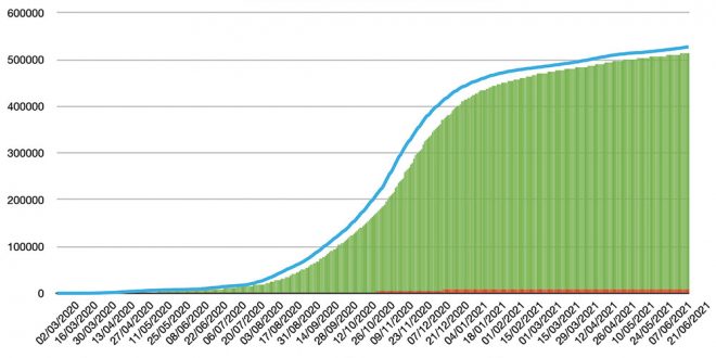Avec seulement 86 nouveaux cas recensés en 24 heures ce lundi 21 juin à 16h, le nombre total de cas de contamination s’élève désormais à 526.737, a annoncé le Ministère de la Santé. Six nouveaux décès sont à déplorer sur les dernières 24 heures, portant le total à 9.244 personnes …