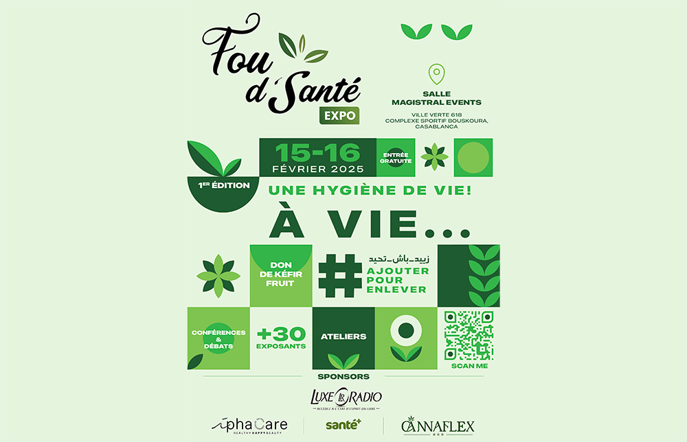Le Complexe Magistral Events de Bouskoura accueillera les 15 et 16 février 2025 à Casablanca, la première édition de Fou d’Santé Expo, un événement inédit dédié à la santé, l’hygiène de vie et la micronutrition. Pendant deux jours, experts, marques écoresponsables et grand public se réuniront pour partager des solutions concrètes et inspirantes dans une ambiance de sensibilisation et de partage, faisant de cet événement, un rendez-vous clé pour adopter une hygiène de vie saine et durable.
