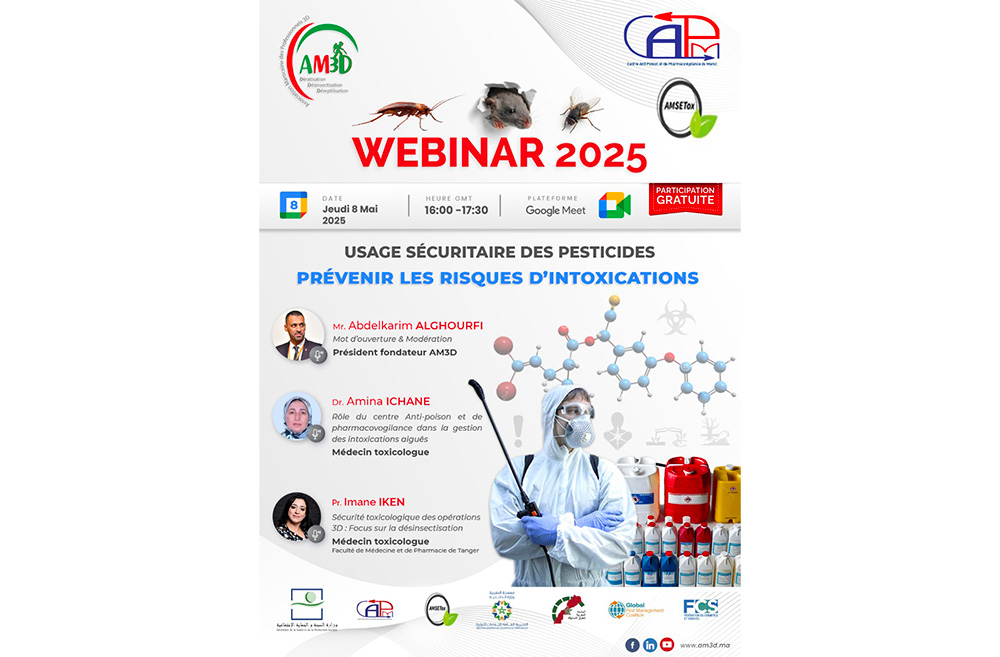 L’AM3D, en partenariat avec le Centre Anti-Poison et de Pharmacovigilance du Maroc, organisera le 8 mai 2025, un webinaire intitulé « Usage sécuritaire des pesticides : prévenir les risques d’intoxications ». L’objectif est de sensibiliser et d’informer sur les bonnes pratiques à adopter pour un usage sécuritaire des pesticides, afin de prévenir les risques d’intoxications.