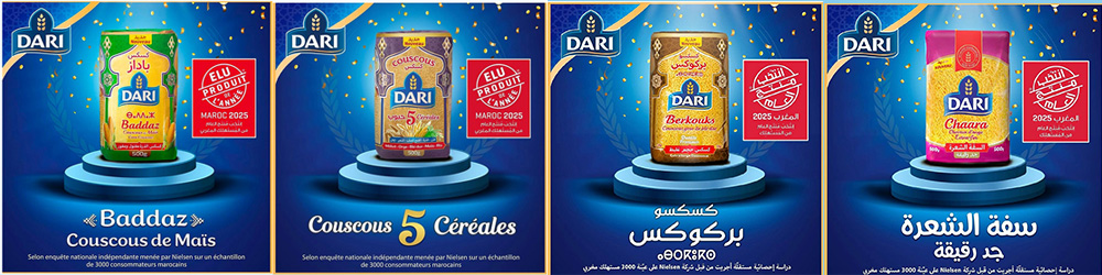 Les produits Dari – Couscous Baddaz (à base de semoule de maïs), Couscous aux 5 céréales (millet, orge, blé dur complet, maïs, riz), Berkouks (couscous gros de blé dur) et Cheveux d’ange extra-fin – ont été élus « Produits de l’Année 2025 » au Maroc. Cette distinction résulte d’une enquête indépendante menée par Nielsen auprès de 3 000 consommateurs marocains, évaluant les produits selon des critères de satisfaction, d’innovation et d’intention d’achat.