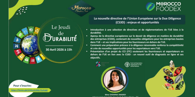 Dans le cadre de l’accompagnement des exportateurs, Morocco Foodex via le Centre CAP’EXPORT, en partenariat avec le Centre du commerce international (ITC), a annoncé le lancement d’une série de webinaires consacrés à la durabilité et à la diligence raisonnable. Cette initiative, menée en collaboration avec l’Organisation pour l’alimentation et l’agriculture (FAO), le Programme Suisse de Promotion des Importations (SIPPO) et l’Institut Panafricain pour le Développement (IPD), vise à renforcer la compétitivité des entreprises sur les marchés internationaux.