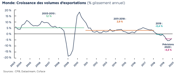 En termes de chiffres, Coface prévoit en 2020 la première récession de l’économie mondiale depuis 2009 : -1,3% (vs +2,5% en 2019), une récession qui devrait toucher 68 pays (vs 11 en 2019), un recul du commerce mondial en volume de 4,3% (vs -0,4% en 2019) et une augmentation de 25% des défaillances d’entreprises dans le monde (contre seulement +2% prévu en janvier dernier).