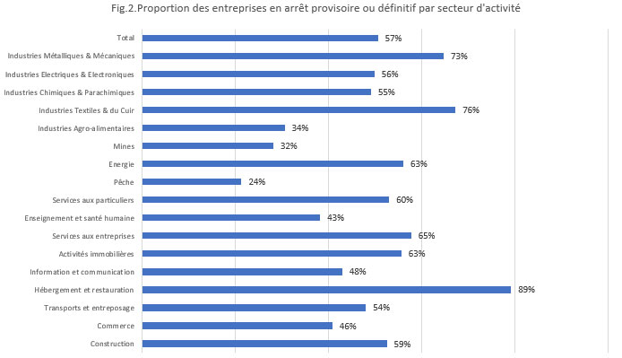 Enfin, la fermeture des frontières à l’échelle mondiale aurait un impact sur 67% des entreprises exportatrices : « une entreprise sur 9 aurait arrêté définitivement son activité, 5 sur 9 entreprises auraient procédé à un arrêt temporaire, alors qu’un tiers des entreprises restent encore en activité mais elles auraient dû réduire leur production », indique le HCP.