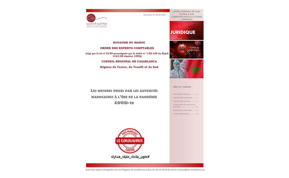 Dans un recueil des principales mesures prises par les autorités marocaines à l’ère de la pandémie du Covid-19, publié par le Conseil Régional de Casablanca & Sud de l’Ordre des Experts-Comptables, 6 volets ont été traités en détail, notamment les dispositions fiscales, les dispositions juridiques, les dispositions sociales, les dispositions de l’Office des Changes, les dispositions bancaires et autres, et ce afin de faciliter leur compréhension voire leur mise œuvre par les parties concernées.