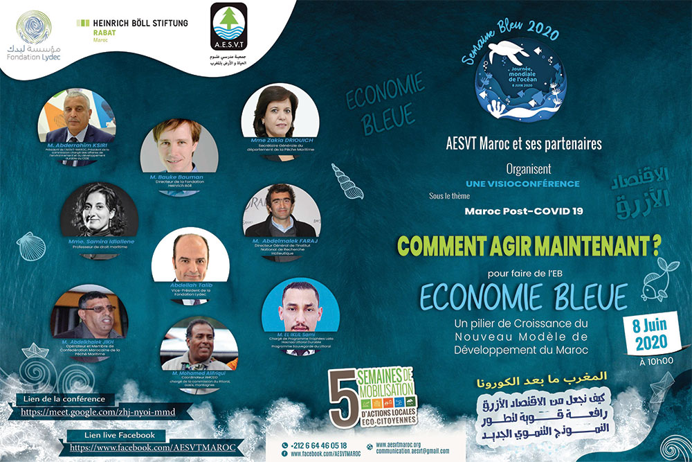 En célébration de la journée mondiale des océans, l’Association des Enseignants des Sciences de la Vie et de la Terre au Maroc (AESVT-Maroc) et ses partenaires organisent visioconférence sous le thème : « Maroc Post-Covid19 : Comment agir pour faire de l’Économie Bleue un pilier de croissance du Nouveau Modèle de Développement du Maroc ». L’événement se tiendra le 8 juin à 10h00 GMT sur la plateforme Google Meet.