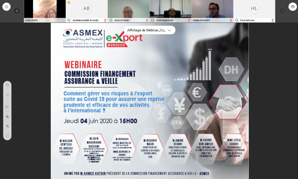 La Commission financement, assurance et veille de l’Association Marocaine des Exportateurs (ASMEX) a organisé le 4 juin une visioconférence sous le thème : « Comment gérer vos risques à l’export suite au Covid-19 pour une reprise prudente et efficace de vos activités à l’international ? ». Cette rencontre s’inscrit dans le cadre des actions d’accompagnement et de sensibilisation des membres de l’ASMEX, afin de mieux gérer cette période de crise et assurer une reprise efficace de leurs activités à l’international. Ainsi, les intervenants ont évoqué les scénarios de la reprise et les risques liés aux exportations, les dispositifs pris face aux retards des paiements en cas de créances douteuses ou en cas de créances non récupérables et les mécanismes de soutien financiers offerts par le CCG en faveur des entreprises impactées par la crise. De plus, ils ont discuté de la réduction de l’impact du Covid-19 sur le portefeuille clients à l’export, les outils dont disposent les exportateurs pour une meilleure gestion des risques liés à l’export ou encore les outils de paiement et de financement à l’international adaptés en cette période de crise.