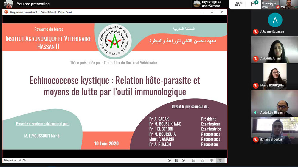 Dans les conditions de confinement, l’Institut Agronomique et Vétérinaire Hassan II (IAV Hassan II) a organisé la première soutenance en ligne, le 10 juin. Il s’agit du candidat Mahdi El Youssoufi, étudiant en 6ème année vétérinaire et élève officier du corps de santé des FAR. Il a réalisé un travail de thèse sous la direction du Pr Rhalem sous le thème « Echinococcose kystique : relation hôte-Parasite et moyens de contrôle par l’outil immunologique », au niveau de l’Unité de Parasitologie, Département de Pathologie et Santé Publique Vétérinaire de l’IAV Hassan II.