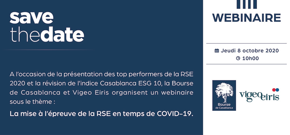 Dans le contexte actuel, la RSE (Responsabilité Sociétale des Entreprises) pourrait sembler non prioritaire. La Bourse de Casablanca et Vigeo Eiris se sont penchés sur le sujet et proposent un webinaire le 8 octobre prochain sur le thème « La mise à l’épreuve de la RSE en temps de Covid-19 ».