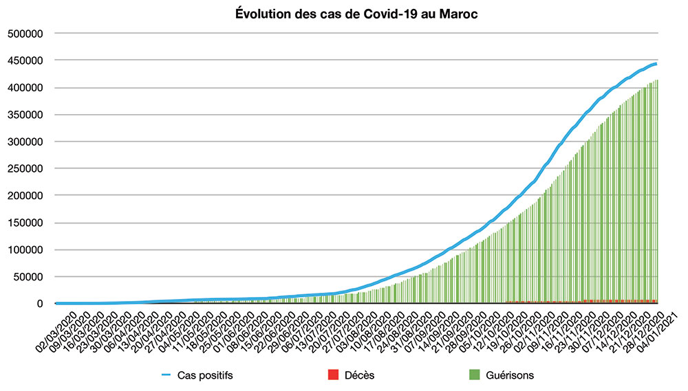 Avec seulement 656 nouveaux cas recensés en 24 heures ce lundi 4 janvier à 18h, la tendance baissière se confirme pour l’instant, sachant que seulement 7.858 tests ont été effectués sur cette période. Le nombre total de cas de contamination s’élève désormais à 443.802, a annoncé le Ministère de la Santé. 53 nouveaux décès sont à déplorer sur les dernières 24 heures, portant le total à 7.538 personnes. En moyenne, 1.539 nouveaux cas ont été enregistrés chaque jour lors de la semaine qui vient de s’écouler, soit 608 cas quotidiens de moins que la semaine précédente.