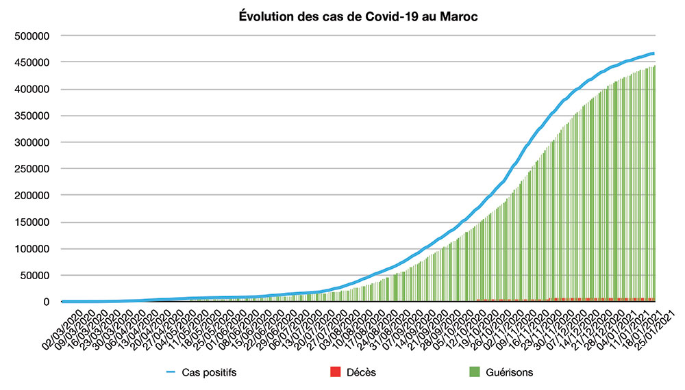 Avec seulement 337 nouveaux cas recensés en 24 heures ce lundi 25 janvier à 18h, les contaminations connaissent un record à la baisse, sachant que seulement 5.779 tests ont été pratiqués sur cette période. Le nombre total de cas de contamination s’élève désormais à 466.626, a annoncé le Ministère de la Santé. 22 nouveaux décès sont à déplorer sur les dernières 24 heures, portant le total à 8.172 personnes (taux de létalité de 1,8%). En moyenne, 926 nouveaux cas ont été enregistrés chaque jour lors de la semaine qui vient de s’écouler, soit 96 cas quotidiens de moins que la semaine précédente.