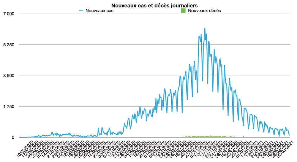Avec seulement 102 nouveaux cas recensés en 24 heures ce lundi 8 mars à 18h, le nombre total de cas de contamination s’élève désormais à 486.325, a annoncé le Ministère de la Santé. Un nouveau décès est à déplorer sur les dernières 24 heures, portant le total à 8.683 personnes (taux de létalité stable à 1,8%). En moyenne, 366 nouveaux cas ont été enregistrés chaque jour lors de la semaine qui vient de s’écouler, soit 8 cas quotidiens de plus que la semaine précédente – ce qui pourrait indiquer l’arrivée à un plateau épidémique.