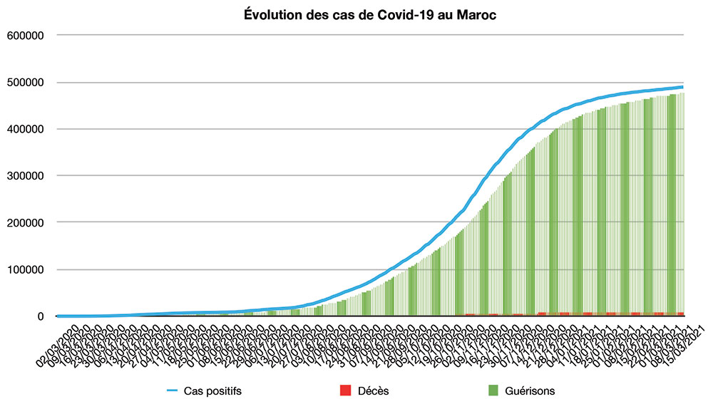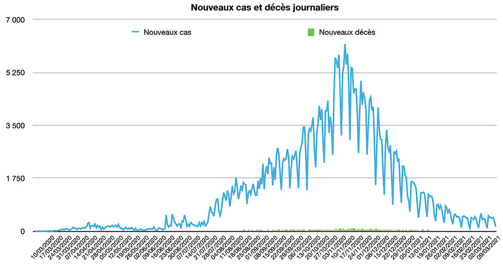 Avec 159 nouveaux cas recensés en 24 heures ce lundi 8 mars à 18h, le nombre total de cas de contamination s’élève désormais à 489.096, a annoncé le Ministère de la Santé. 10 nouveaux décès sont à déplorer sur les dernières 24 heures, portant le total à 8.733 personnes (taux de létalité stable à 1,8%). En moyenne, 396 nouveaux cas ont été enregistrés chaque jour lors de la semaine qui vient de s’écouler, soit 30 cas quotidiens de plus que la semaine précédente – ce qui confirmerait l’arrivée à un plateau épidémique.
