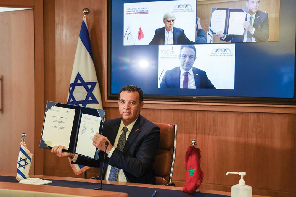 Le 22 mars 2021, Chakib Alj, Président de la Confédération Générale des Entreprises du Maroc (CGEM), Dr Ron Tomer, Président de The Israeli Employers and Business Organizations (IEBO) et de la Manufacturers’ Association of Israel (MAI) et Uriel Lynn, Président de la Federation of Israeli Chambers of Commerce (FICC), ont signé, par visioconférence, un accord de partenariat stratégique afin de promouvoir les relations économiques et commerciales et le développement technologique entre le Maroc et Israël.