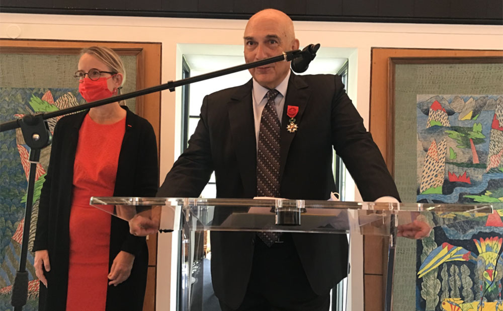 Le 30 mars 2021 à la Résidence de France à Rabat, l’Ambassadrice Hélène Le Gal a remis les insignes d’Officier de la Légion d’Honneur à Mostafa Terrab, Président Directeur Général de l’Office Chérifien des Phosphates.