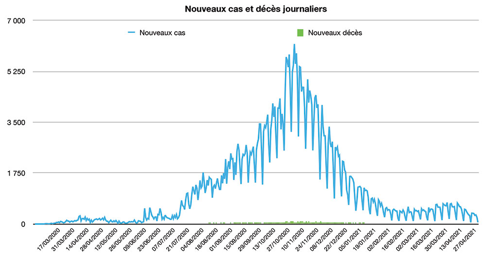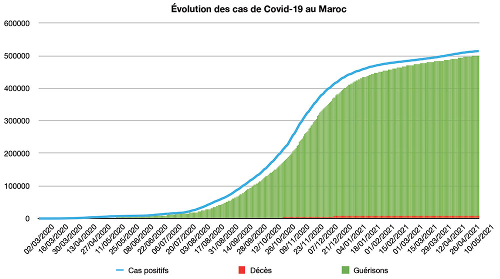 Avec seulement 58 nouveaux cas recensés en 24 heures ce lundi 10 mai à 16h, le nombre total de cas de contamination s’élève désormais à 513.922, a annoncé le Ministère de la Santé. Cinq nouveaux décès sont à déplorer sur les dernières 24 heures, portant le total à 9.077 personnes (taux de létalité stable à 1,8%). En moyenne, 287 nouveaux cas ont été enregistrés chaque jour lors de la semaine qui vient de s’écouler, soit 62 cas quotidiens de moins que la semaine précédente.