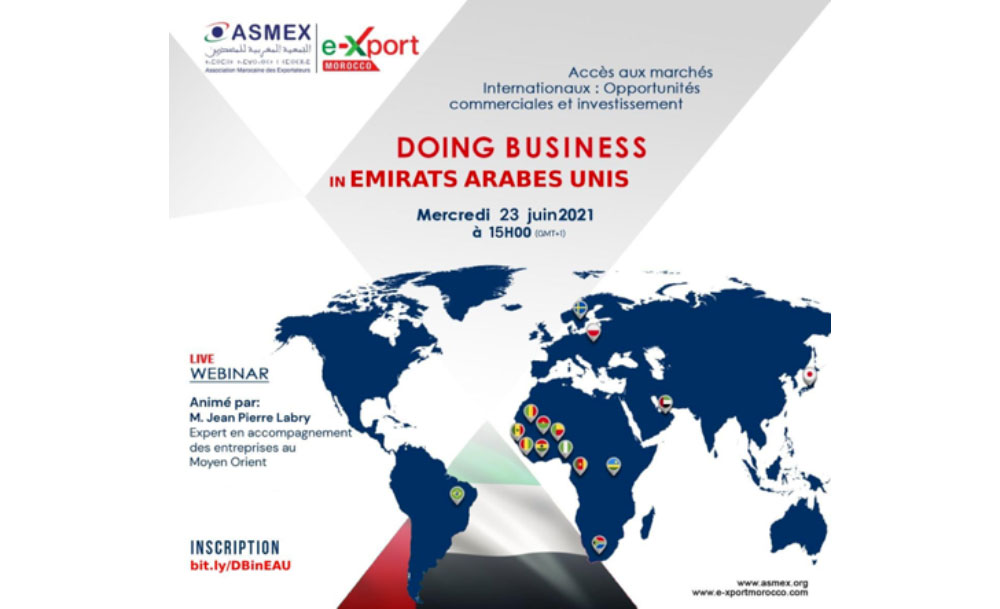 Dans le cadre de sa série de séminaires virtuels organisés sur l’accès aux marchés et le recensement des opportunités d’exportation et d’investissement, l’Association marocaine des exportateurs (ASMEX) a annoncé l’organisation d’un webinaire le 23 juin 2021, destiné à mettre la lumière sur les opportunités d’investissement aux Émirats Arabes Unis (UAE).