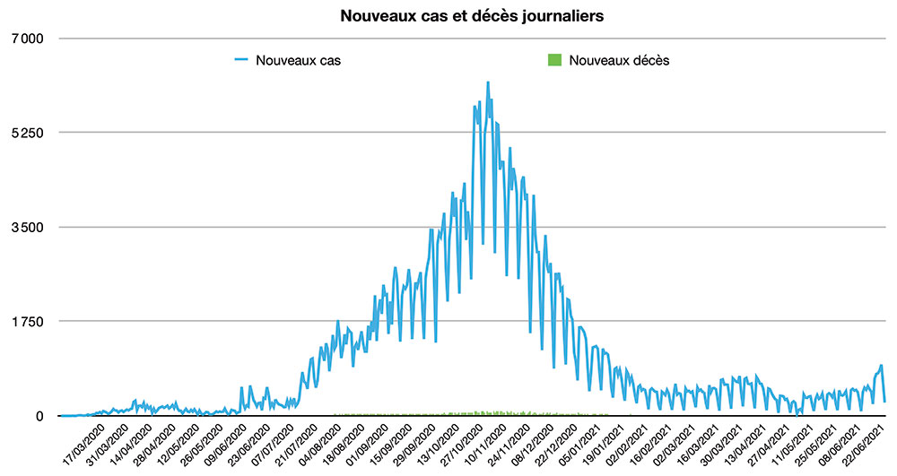Avec 247 nouveaux cas recensés en 24 heures ce lundi 5 juillet à 16h, le nombre total de cas de contamination s’élève désormais à 534.797, a annoncé le Ministère de la Santé. Dix nouveaux décès sont à déplorer sur les dernières 24 heures, portant le total à 9.329 personnes (taux de létalité en légère baisse à 1,7%). En moyenne, 700 nouveaux cas ont été enregistrés chaque jour lors de la semaine qui vient de s’écouler, soit 249 cas quotidien de plus que la semaine précédente.
