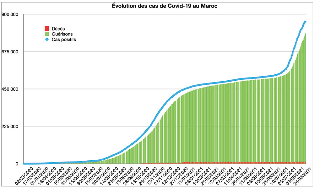 Avec 2.676 nouveaux cas recensés en 24 heures ce lundi 30 août à 16h, le nombre total de cas de contamination s’élève désormais à 856.049, a annoncé le Ministère de la Santé. 103 nouveaux décès sont à déplorer sur les dernières 24 heures, portant le total à 12.540 personnes (taux de létalité stable à 1,5%). En moyenne, 6.015 nouveaux cas ont été enregistrés chaque jour lors de la semaine qui vient de s’écouler, soit 1.213 cas quotidiens de moins que la semaine précédente, ce qui semble confirmer un ralentissement des contaminations.