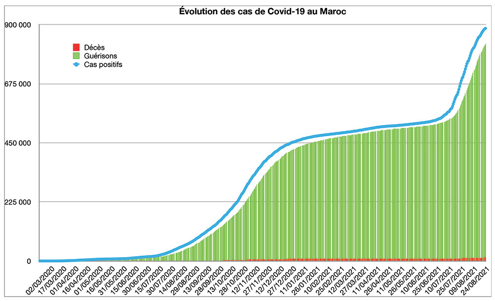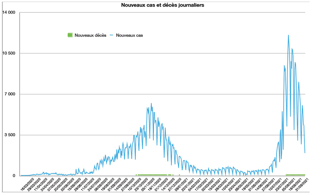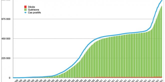 Avec 1.923 nouveaux cas recensés en 24 heures ce lundi 6 septembre à 16h, le nombre total de cas de contamination s’élève désormais à 886.008, a annoncé le Ministère de la Santé. 72 nouveaux décès sont à déplorer sur les dernières 24 heures, portant le total à 13.145 personnes (taux de létalité stable à 1,5%). En moyenne, 4.280 nouveaux cas ont été enregistrés chaque jour lors de la semaine qui vient de s’écouler, soit 1.735 cas quotidiens de moins que la semaine précédente, ce qui confirme un ralentissement des contaminations.