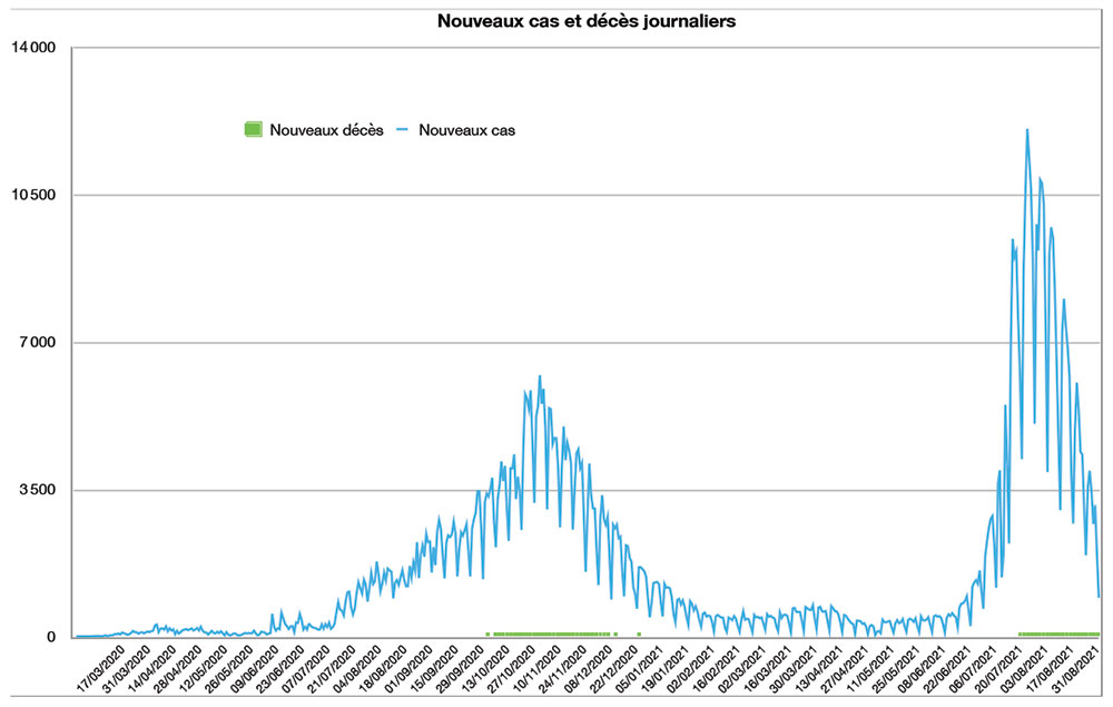 Avec 917 nouveaux cas recensés en 24 heures ce lundi 13 septembre à 16h, le nombre total de cas de contamination s’élève désormais à 905 564, a annoncé le Ministère de la Santé. 72 nouveaux décès sont à déplorer sur les dernières 24 heures, portant le total à 13 618 personnes (taux de létalité stable à 1,5%). En moyenne, 2 794 nouveaux cas ont été enregistrés chaque jour lors de la semaine qui vient de s’écouler, soit 1 486 cas quotidiens de moins que la semaine précédente, ce qui confirme un ralentissement des contaminations.