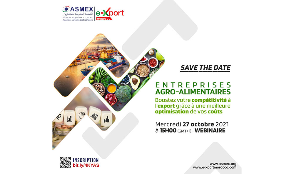 Le 27 octobre 2021 à 15h, l’ASMEX (Association marocaine des exportateurs) propose un nouveau webinaire sous le thème : « Entreprises agroalimentaires – Boostez votre compétitivité à l’export grâce à une meilleure optimisation de vos coûts ».