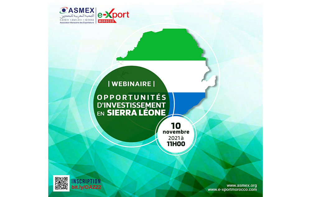 L’Association marocaine des exportateurs (ASMEX) organise, le 10 novembre à 11h00, un webinaire en partenariat avec l’Ambassade de Sierra Leone et le cabinet Zafrixcs, sous le thème : « Opportunités d’investissement en Sierra Léone ».