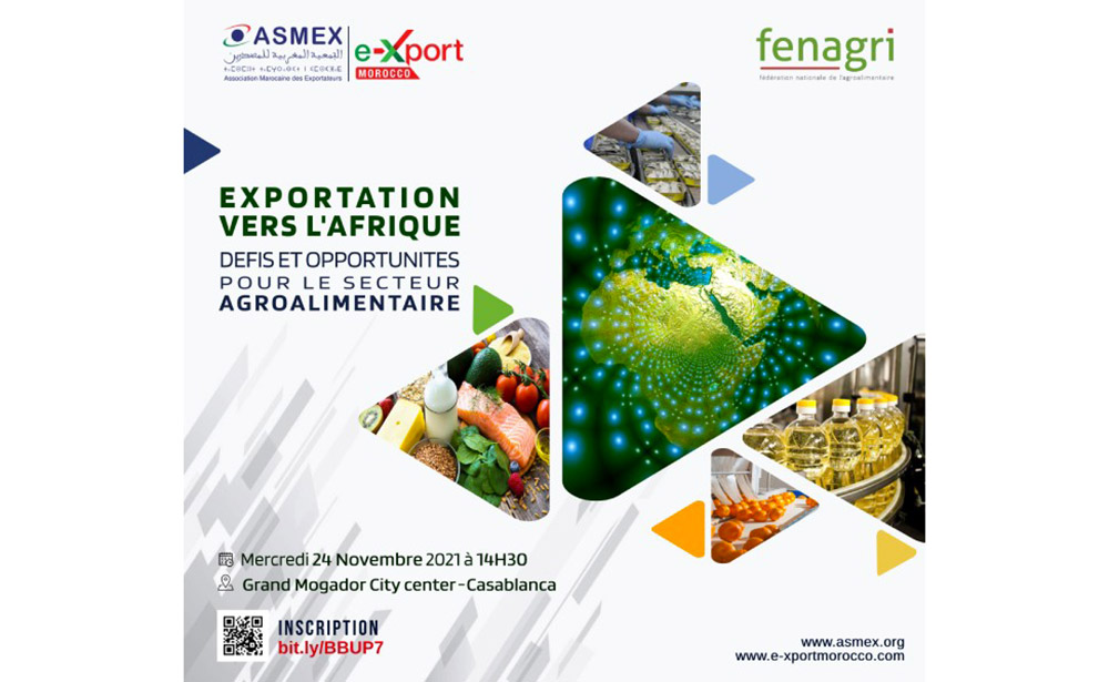 Dans le cadre de son travail d’accompagnement des exportateurs marocains, l’Association marocaine des exportateurs (ASMEX) organise le 24 novembre 2021 à Casablanca un séminaire sous le thème « Exportation vers l’Afrique : défis & opportunités pour le secteur agroalimentaire ».