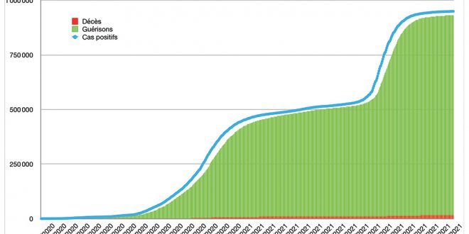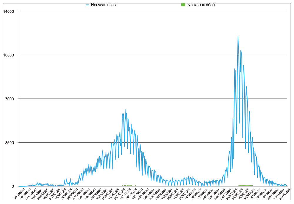 Avec 53 nouveaux cas recensés en 24 heures ce lundi 29 novembre à 16h, le nombre total de cas de contamination s’élève désormais à 949 785, a annoncé le Ministère de la santé. Un nouveau décès est à déplorer sur les dernières 24 heures, portant le total à 14 775 personnes (taux de létalité à 1,6%). En moyenne, 116 nouveaux cas ont été enregistrés chaque jour lors de la semaine qui vient de s’écouler, soit 15 cas quotidiens de plus que la semaine précédente.