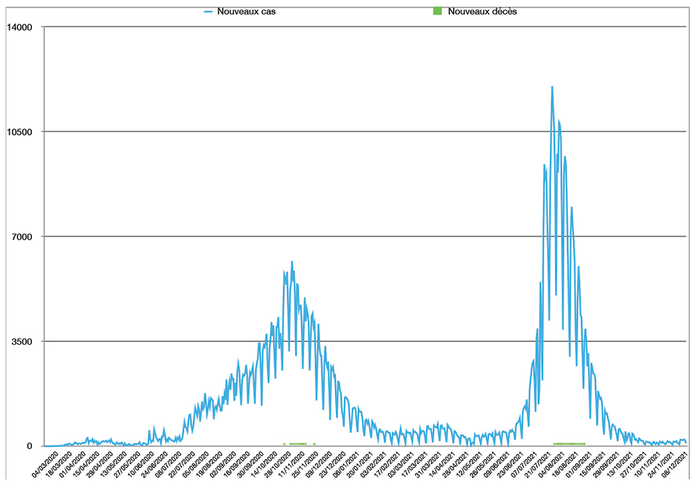 Avec 102 nouveaux cas recensés en 24 heures ce lundi 20 décembre à 16h, le nombre total de cas de contamination s’élève désormais à 952 916, a annoncé le ministère de la Santé. Un nouveau décès est à déplorer sur les dernières 24 heures, portant le total de décès à 14 810 personnes (taux de létalité de 1,6%). En moyenne, 196 nouveaux cas ont été enregistrés chaque jour lors de la semaine qui vient de s’écouler, soit 67 cas quotidiens de plus que la semaine précédente.
