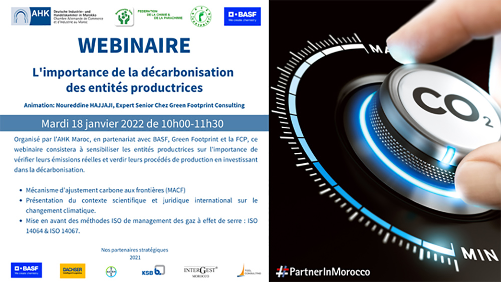 Suite à la décision de l’Union Européenne de n’accepter sur son marché que les produits décarbonés dès début 2023, la Chambre de commerce allemande (AHK) au Maroc a décidé d’organiser, en partenariat avec BASF, Green Footprint et la FCP, un webinaire le 18 janvier 2022 sur l’importance de la décarbonation des entités productrices.