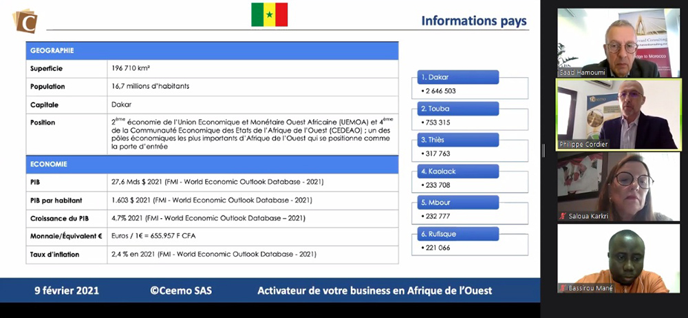 « Doing Business with Senegal (secteur agroalimentaire) » est l’intitulé du webinaire organisé le 15 décembre 2021 par l’Association marocaine des exportateurs (ASMEX), en partenariat avec le cabinet Harvard Consulting. « Dans le cadre des webinaires spécifiques par secteur d’activité, le Sénégal est à l’honneur. Pays proche du Royaume, le Sénégal engendre de l’engouement dès qu’il s’agit d’évoquer ses opportunités d’investissements que nous espérons voir se traduire sur le terrain en véritables grands projets. L’ASMEX promet d’accompagner les investisseurs et exportateurs marocains dans leurs démarches pour s’ouvrir au marché sénégalais et espère pouvoir organiser, si la situation sanitaire le permet, des séminaires en présentiel, dans le même sens en 2022 », a déclaré Saloua Karkri Belkeziz, présidente de la commission Afrique de l’ASMEX.