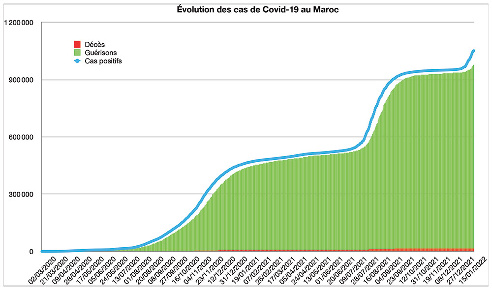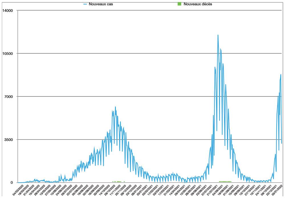 Avec 3 177 nouveaux cas recensés en 24 heures ce lundi 17 janvier à 16h, le nombre total de cas de contamination s’élève désormais à 1 051 830, a annoncé le ministère de la Santé. Dix-huit nouveaux décès sont à déplorer sur les dernières 24 heures, portant le total de décès à 14 994 personnes (taux de létalité en légère baisse, à 1,4%). En moyenne, 6 218 nouveaux cas ont été enregistrés chaque jour lors de la semaine qui vient de s’écouler, soit 671 cas quotidiens de plus que la semaine précédente. Le nombre de contaminations continue donc d’augmenter, mais moins vite que la semaine précédente.