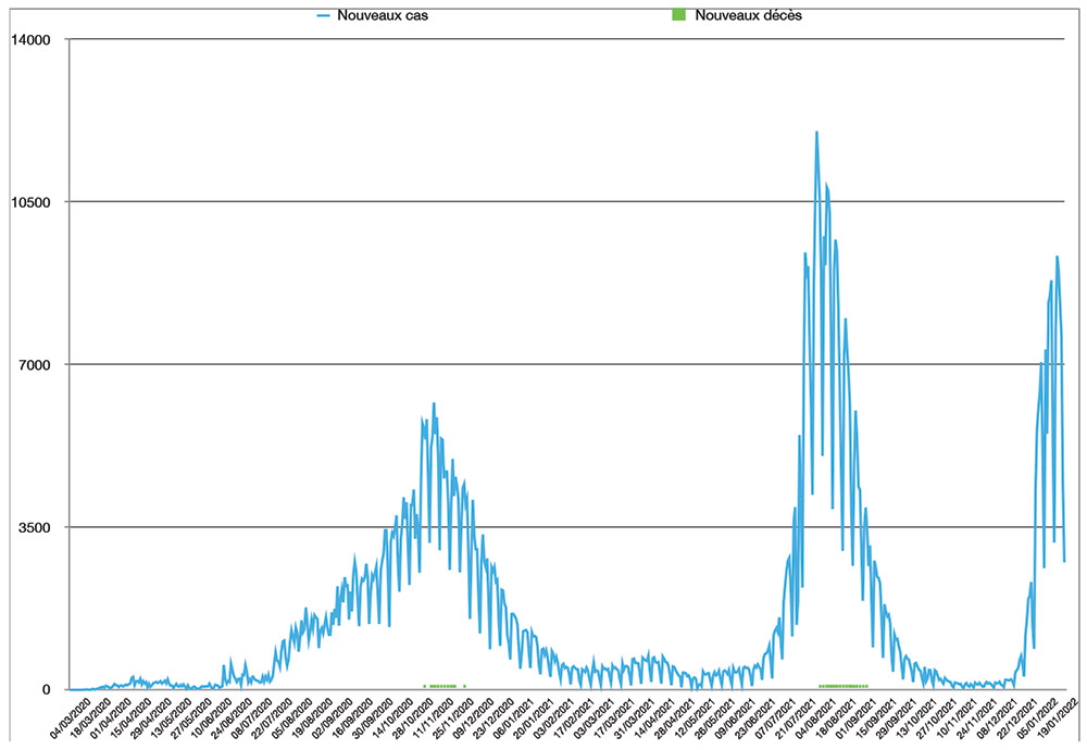 Avec 2 750 nouveaux cas recensés en 24 heures ce lundi 24 janvier à 16h, le nombre total de cas de contamination s’élève désormais à 1 101 163, a annoncé le ministère de la Santé. Trente-cinq nouveaux décès sont à déplorer sur les dernières 24 heures, portant le total de décès à 15 167 personnes (taux de létalité stable, à 1,4%). En moyenne, 6 564 nouveaux cas ont été enregistrés chaque jour lors de la semaine qui vient de s’écouler, soit 346 cas quotidiens de plus que la semaine précédente. Le nombre de contaminations continue donc d’augmenter, mais toujours moins vite de semaine en semaine.