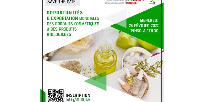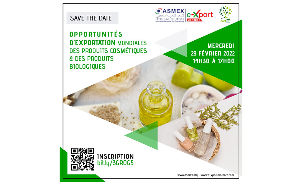 Le 23 février à Casablanca, l’Association marocaine des exportateurs (ASMEX) organise, en partenariat avec FAMIbio, une conférence-débat autour du thème : « Opportunités d’exportation mondiales des produits cosmétiques & des produits biologiques ». Destinée aux PME, TPE et coopératives opérant notamment dans les secteurs des produits cosmétiques et des produits biologiques, cette conférence a pour objectif de débattre des opportunités d’exportation.