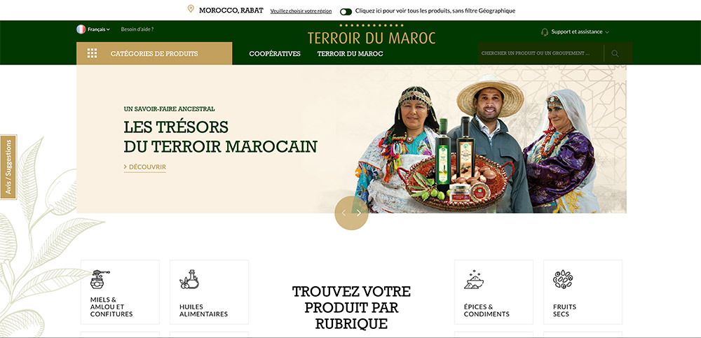 Disponible sur le site www.terroirdumaroc.gov.ma, cette e-vitrine sera le lien direct entre les consommateurs et professionnels nationaux et internationaux, d’une part, et les producteurs de produits du terroir, d’autre part. Elle proposera une large gamme de produits du terroir marocain en présentant, dans une première phase, plus de 680 articles, produits par 70 groupements de produits du terroir (représentant plus de 5 000 producteurs dont 46% sont des femmes rurales). L’objectif est d’atteindre 200 groupements à fin 2022.