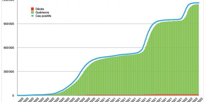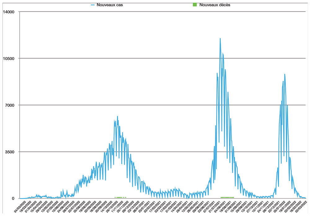 Avec 29 nouveaux cas recensés en 24 heures ce lundi 14 mars à 16h, le nombre total de cas de contamination s’élève désormais à 1 162 125, a annoncé le ministère de la Santé. Quatre nouveaux décès sont à déplorer sur les dernières 24 heures, portant le total de décès à 16 043 personnes (taux de létalité stable, à 1,4%). En moyenne, 61 nouveaux cas ont été enregistrés chaque jour lors de la semaine qui vient de s’écouler, soit 42 cas quotidiens de moins que la semaine précédente.
