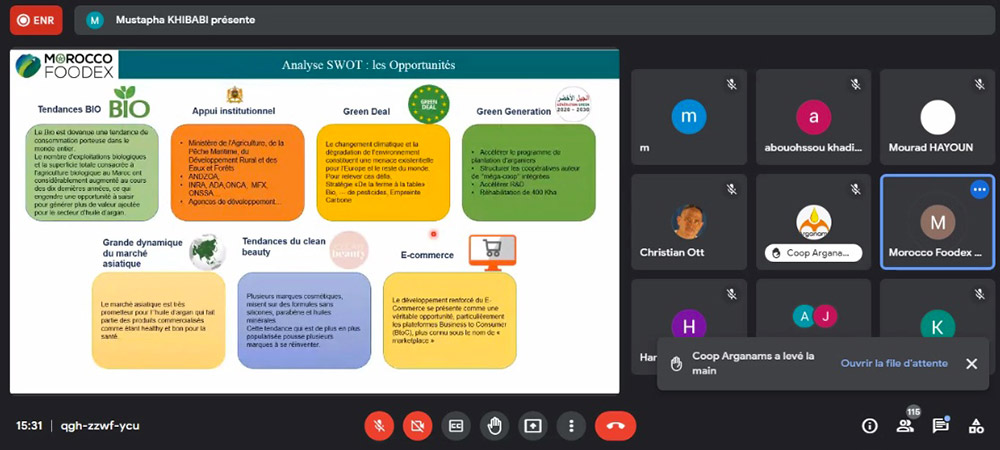 Produit à forte demande, l’huile d’argan se différencie par son caractère unique, combinant biodiversité agricole, écosystèmes résilients et patrimoine culturel. Conscient de l’importance de l’export au sein de ce secteur, Morocco Foodex a organisé, le 10 mars, un webinaire sous le thème « Stratégie d’exportation de l’huile d’argan : enjeux et opportunités ». L’objectif était de faire l’état des lieux des exportations de la filière d’argan et de mettre en lumière les marchés potentiels, le positionnement du Maroc sur les marchés extérieurs, ainsi que la stratégie de développement à l’export.