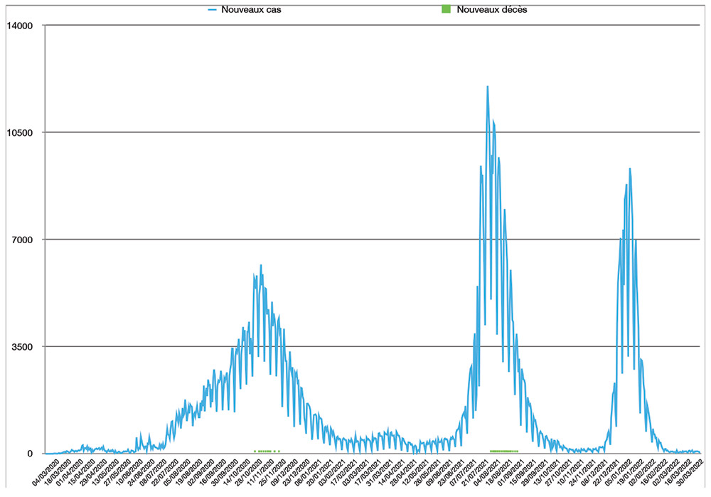 Avec 22 nouveaux cas recensés en 24 heures ce lundi 11 avril, le nombre total de cas de contamination s’élève désormais à 1 164 052, a annoncé le ministère de la Santé. Aucun nouveau décès est à déplorer sur les dernières 24 heures, avec un total de décès à 16 061 personnes (taux de létalité stable, à 1,4%). En moyenne, 70 nouveaux cas ont été enregistrés chaque jour lors de la semaine qui vient de s’écouler, soit 8 cas quotidiens de moins que la semaine précédente.