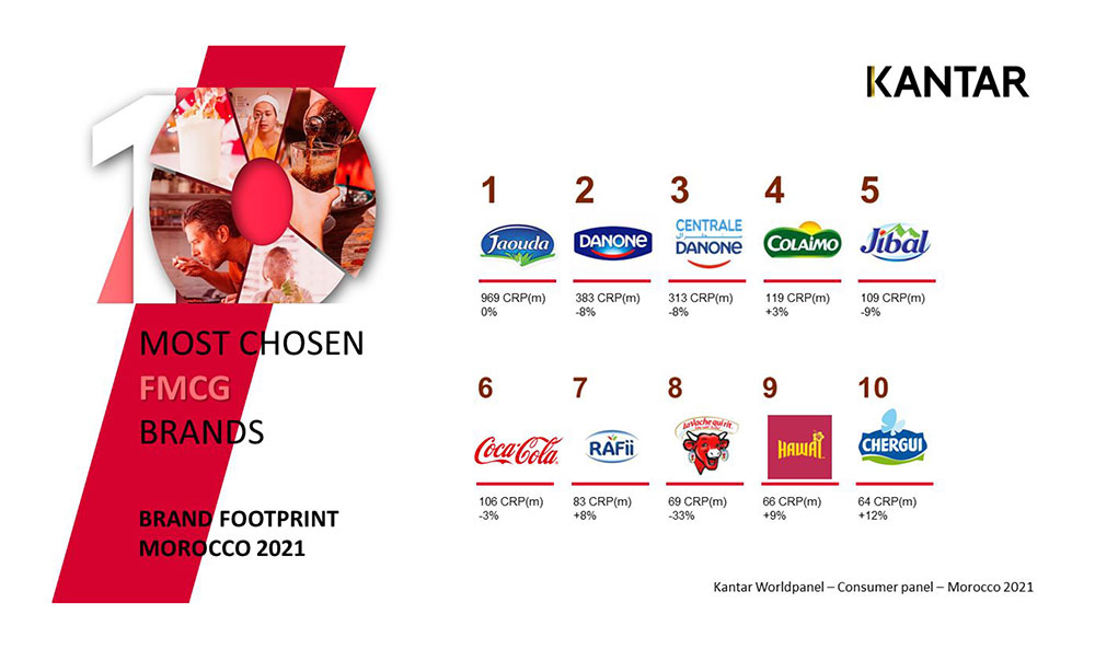 La méthodologie consiste dans le calcul en termes d’achats réels combien de fois la marque a réussi à toucher les 6 millions de foyers marocains durant l’année 2021. Kantar calcule ainsi l’indicateur CRP (Consumer Reach Point ou Point de contact consommateur) selon la formule suivante : population marocaine (6 millions de foyers) X taux de pénétration (pourcentage de foyers ayant acheté la marque au moins une fois durant l’année 2021) X fréquence d’achat en 2021 (nombre de fois durant l’année où les foyers ont acheté la marque).