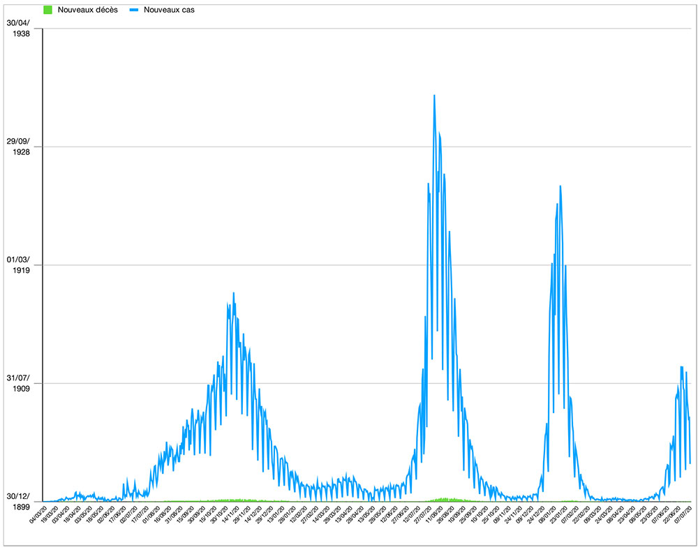 Avec 1 120 nouveaux cas recensés en 24 heures ce dimanche 10 juillet (les données au 11 juillet n’étaient pas encore diffusées à l’heure où nous éditions cette newsletter), le nombre total de cas de contamination s’élève désormais à 1 241 967, a annoncé le ministère de la Santé. Cinq nouveaux décès sont à déplorer sur les dernières 24 heures, avec un total de décès à 16 156 personnes (taux de létalité stable, à 1,3%). En moyenne, 2 620 nouveaux cas ont été enregistrés chaque jour lors de la semaine qui vient de s’écouler, soit 373 cas quotidiens de plus que la semaine précédente.