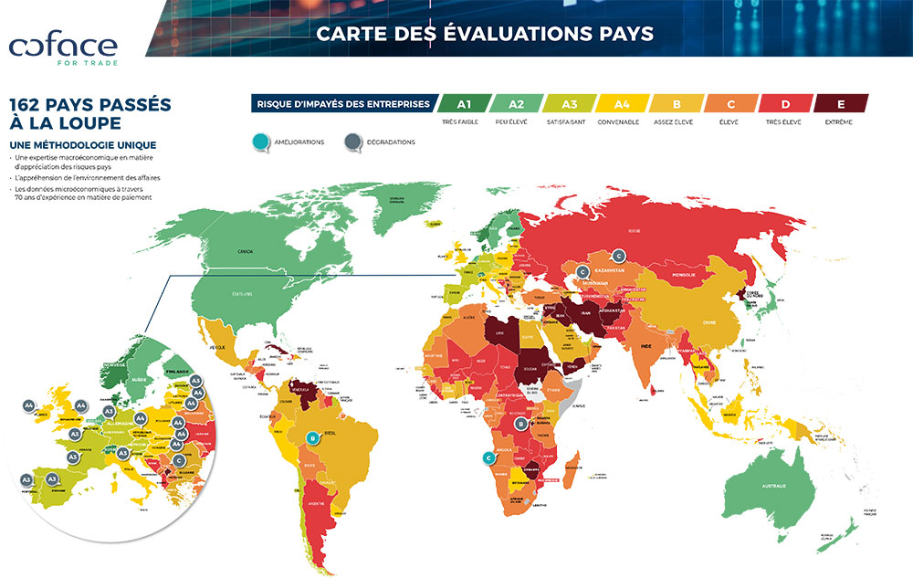 L’environnement économique et financier se détériorant rapidement, Coface a procédé au déclassement de l’évaluation de 16 pays sur le continent européen, dont toutes les principales économies – à l’exception de l’Italie, déjà évaluée en A4. Ainsi, les prévisions de croissance sont particulièrement médiocres dans les pays avancés. Les risques baissiers sur l’économie mondiale sont nombreux, tandis que le risque haussier sur l’inflation demeure. Afin de juguler l’inflation, les banques centrales semblent tentées d’agir jusqu’à pousser l’économie en récession, qu’elles espèrent plus clémente que dans le cas où les prix continueraient de déraper, les contraignant à procéder à un choc monétaire plus violent ultérieurement. Le risque, qu’on ne peut écarter, serait celui d’un recul de la demande et du maintien d’une inflation élevée, en raison de cours des matières premières qui peineraient à s’assagir du fait d’une insuffisance chronique de l’offre.