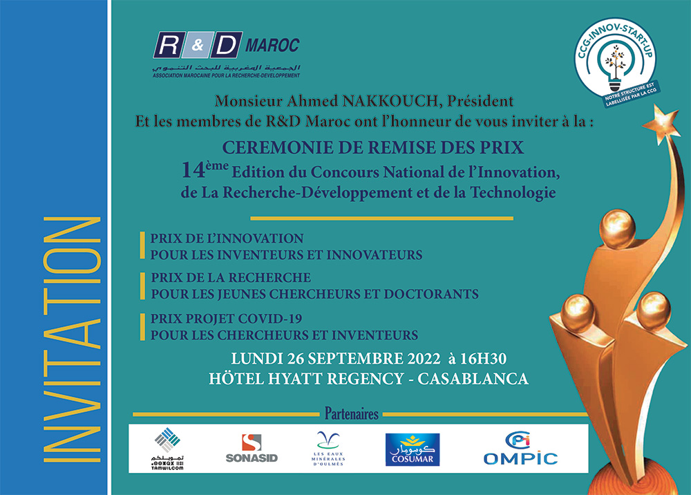 À l’occasion de la tenue de son assemblée générale, R&D Maroc a organisé, le 26 septembre 2022 à Casablanca, la cérémonie de remise des prix de la 14ème édition du concours national de l’innovation, de la recherche-développement et de la technologie, édition 2020-2021. Cette édition du concours a enregistré un taux de participation supérieur à celui des éditions précédentes, dont plus de 35% de projets reçus concernent la pandémie Covid-19. Le nombre total de candidatures était au nombre de 80.