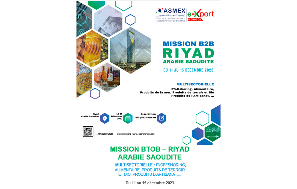 Afin de soutenir les exportateurs marocains dans le développement de leurs activités sur le marché saoudien, l’Association Marocaine des Exportateurs organise une mission B to B du 11 au 15 décembre 2023 à Riyad. Cette initiative cible plusieurs secteurs, dont l’IT/offshoring, l’alimentaire, les produits du terroir et bio, ainsi que les produits de l’artisanat.