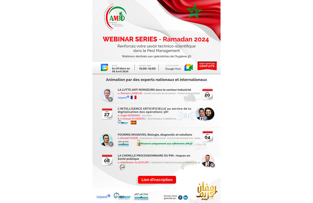 Ce Ramadan 2024, l’Association Marocaine des Professionnels 3D (AM3D) invite les spécialistes de l’hygiène 3D à participer à une série de quatre webinaires gratuits. Ces sessions, animées par des experts nationaux et internationaux, visent à développer les compétences en matière de lutte antiparasitaire.