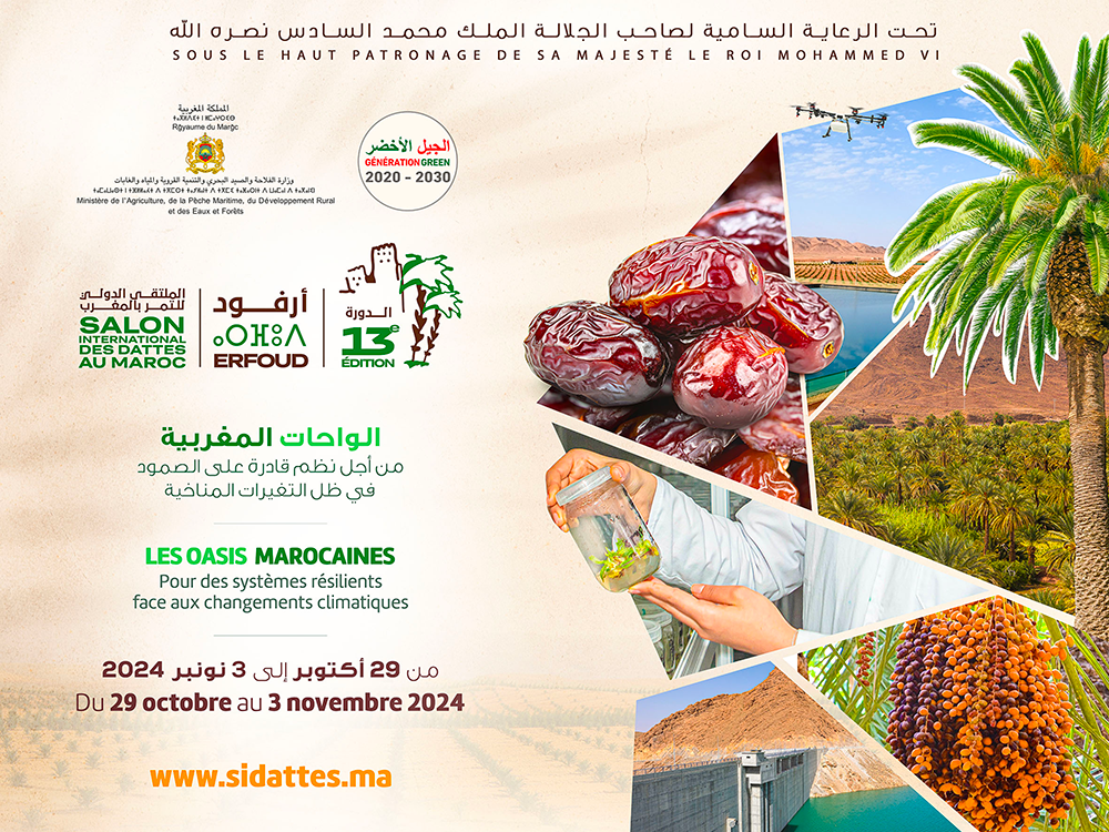 Le Salon International des Dattes au Maroc (SIDATTES) revient à Erfoud pour sa 13ème édition, du 29 octobre au 3 novembre 2024, sous le thème « Les oasis marocaines : pour des systèmes résilients face aux changements climatiques ». Placé sous le Haut Patronage de SM Le Roi Mohammed VI, cet événement est organisé par le Ministère de l’Agriculture, de la Pêche Maritime, du Développement Rural et des Eaux et Forêts et par l’Association du Salon International des Dattes au Maroc (ASIDMA). Il accueillera sur une surface de 40 000 m², 230 exposants et plus de 90 000 visiteurs. Le SIDATTES 2024 se distingue par sept composantes majeures. Le pôle « Régions » mettra à l’honneur les quatre principales zones productrices de dattes au Maroc : Drâa-Tafilalet, l’Oriental, Souss-Massa et Guelmim-Oued Noun. En parallèle, les pôles « Institutionnels et Sponsors » et « International » réuniront des acteurs privés et publics de la chaîne de valeur du palmier dattier, ainsi que des exposants venus de divers pays producteurs.